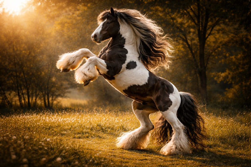 Originally bred by the Romani people, Gypsy Vanner horses embody a kind of grounded elegance with their long, flowing manes, feathered legs, and soft, expressive eyes. Their sturdy build is balanced by a calm, gentle presence that makes them easy to handle and deeply companionable. Often associated with traditional caravans, they carry a sense of history wherever they go. There is something almost storybook about their appearance, as if they stepped out of an old painting, yet their friendly nature makes them feel instantly familiar and approachable to anyone nearby.