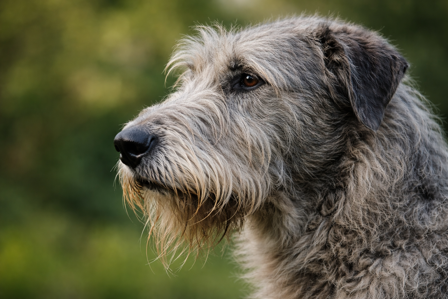Irish Wolfhounds evolved with rough facial hair to shield against wind rain and cold during hunts across open Irish landscapes. The beard protected the muzzle during long pursuits and added insulation without trapping moisture.