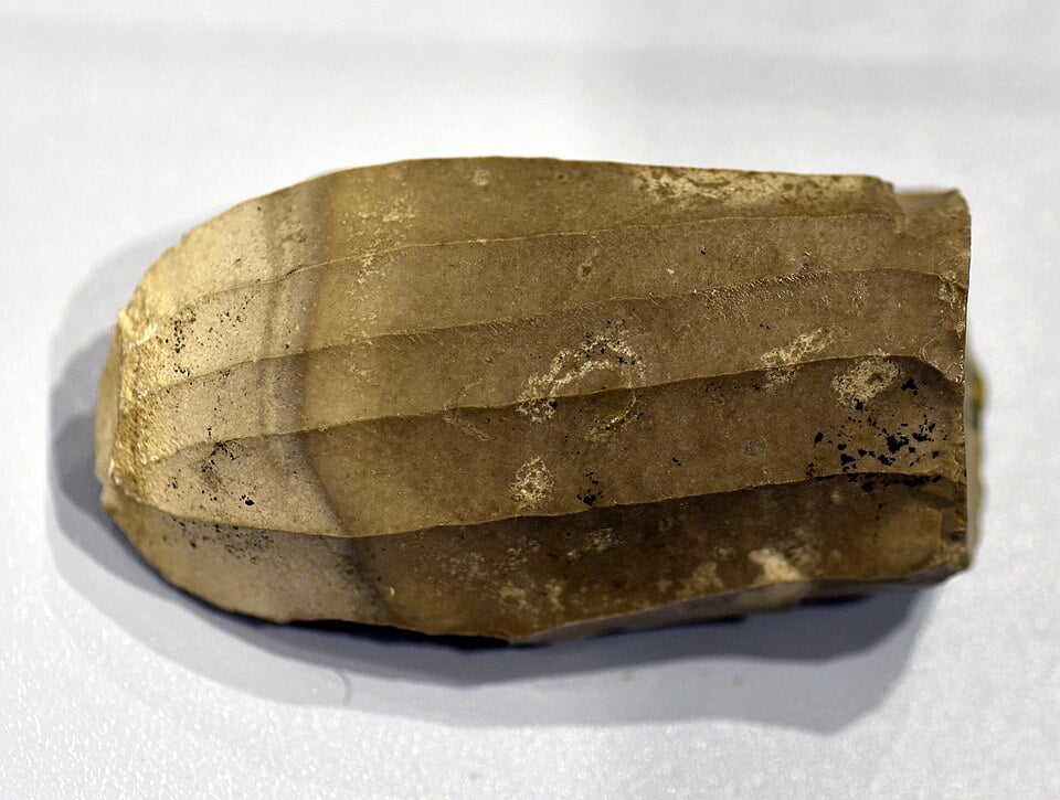 Unlike many sites where only finished tools survive, this workshop contained large flint cores used to detach long blades. These cores retain scars from each removal, allowing researchers to reconstruct the full production sequence step by step. They show how artisans planned ahead, adjusting angles and surfaces to keep blades coming cleanly and efficiently.