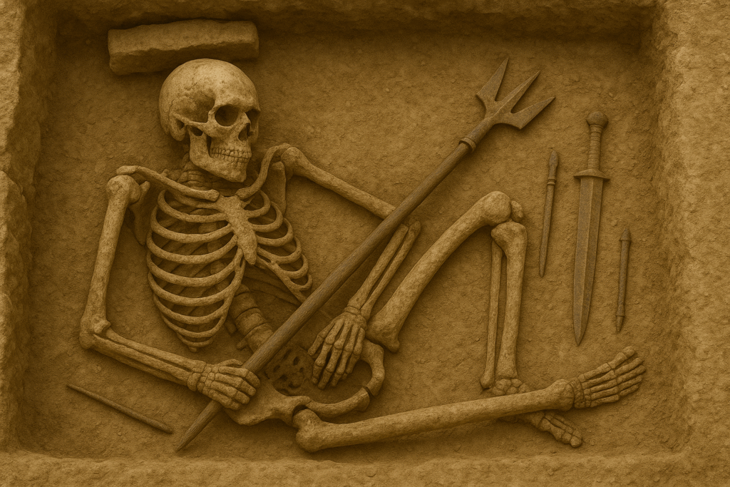 Excavations led by the Azerbaijan National Academy of Sciences in the Keshikchidagh zone uncovered the burial mound on the Ceyranchol plain. The site, reported by Ancient-Origins, is remarkably preserved, with the kurgan measuring around 28 metres in diameter and divided into symbolic chambers. Within this structured burial, the warrior’s remains lay alongside his equipment, untouched since the Bronze Age. The location and scale show that this was an individual of high status, likely a military leader or local elite, whose identity and societal role now become visible through archaeology.