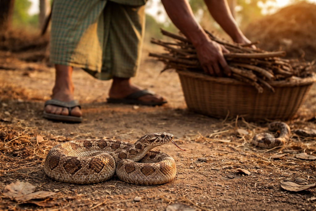 Unlike cinematic snake encounters, most fatal bites do not involve provocation or surprise attacks. Victims are often walking to fields, collecting firewood, or stepping outside at night. The snake is usually unseen. Contact happens at ankle level when a foot lands inches from a coiled body that relies on camouflage to remain undetected.