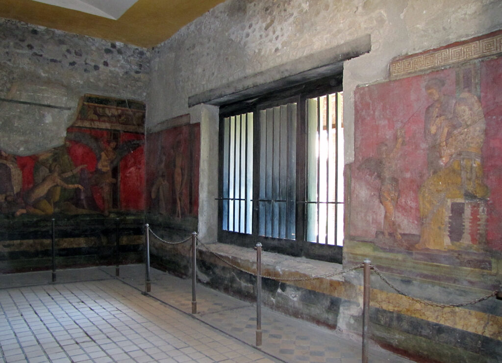 The architectural proportions of the chamber align with known Roman triclinia, where guests reclined in specific arrangements. The frescoes interact with these positions, placing figures at eye level for diners rather than standing viewers.