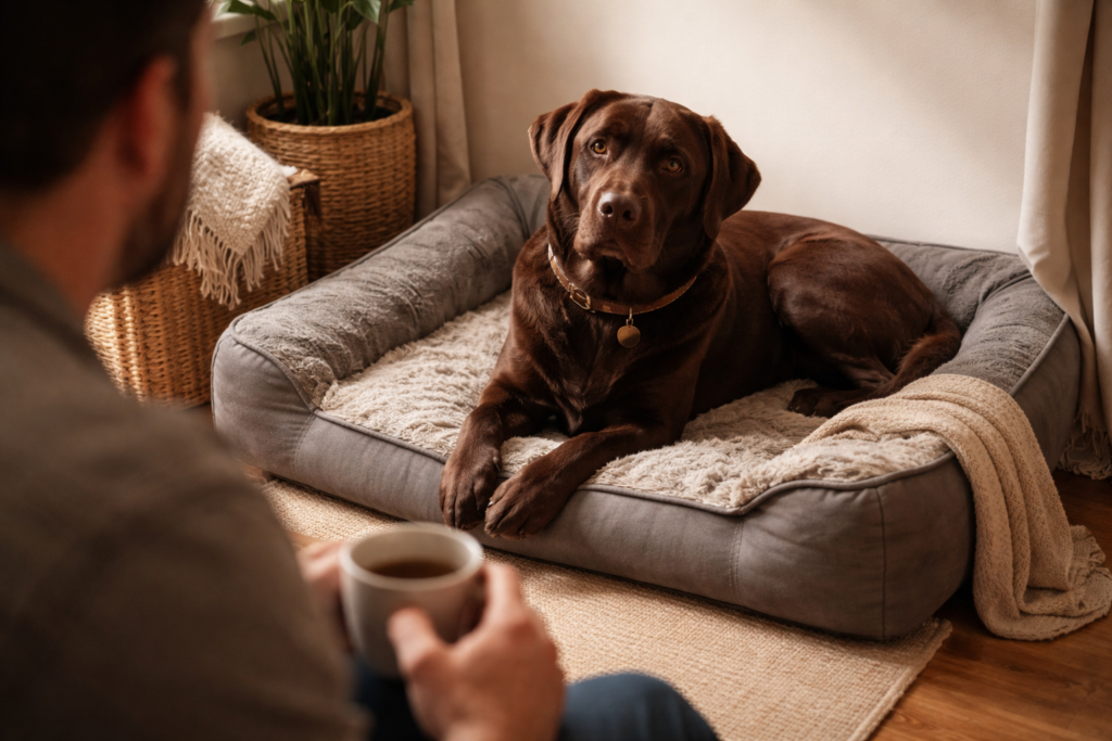 When a dog watches peacefully from across the room, it signals confidence. The environment feels stable. The relationship feels secure.