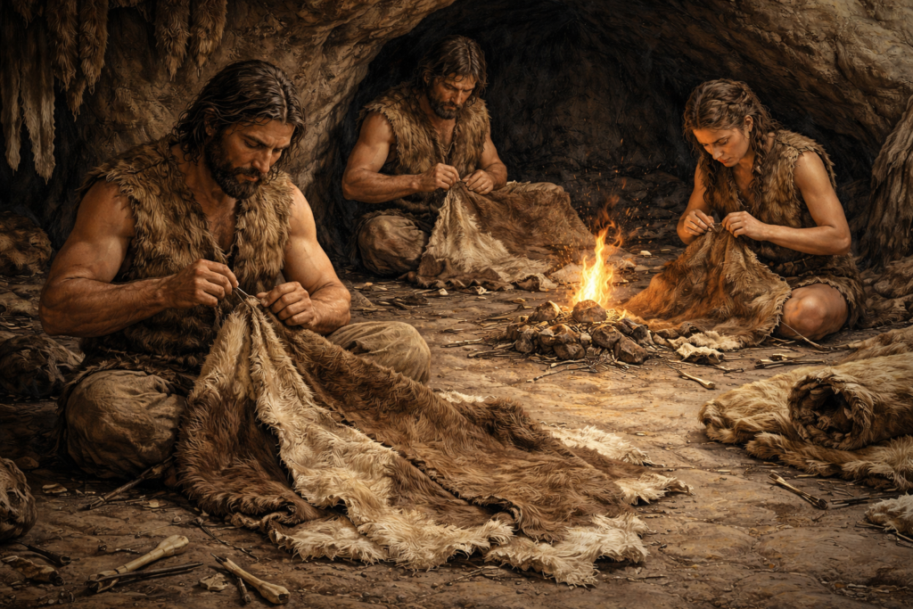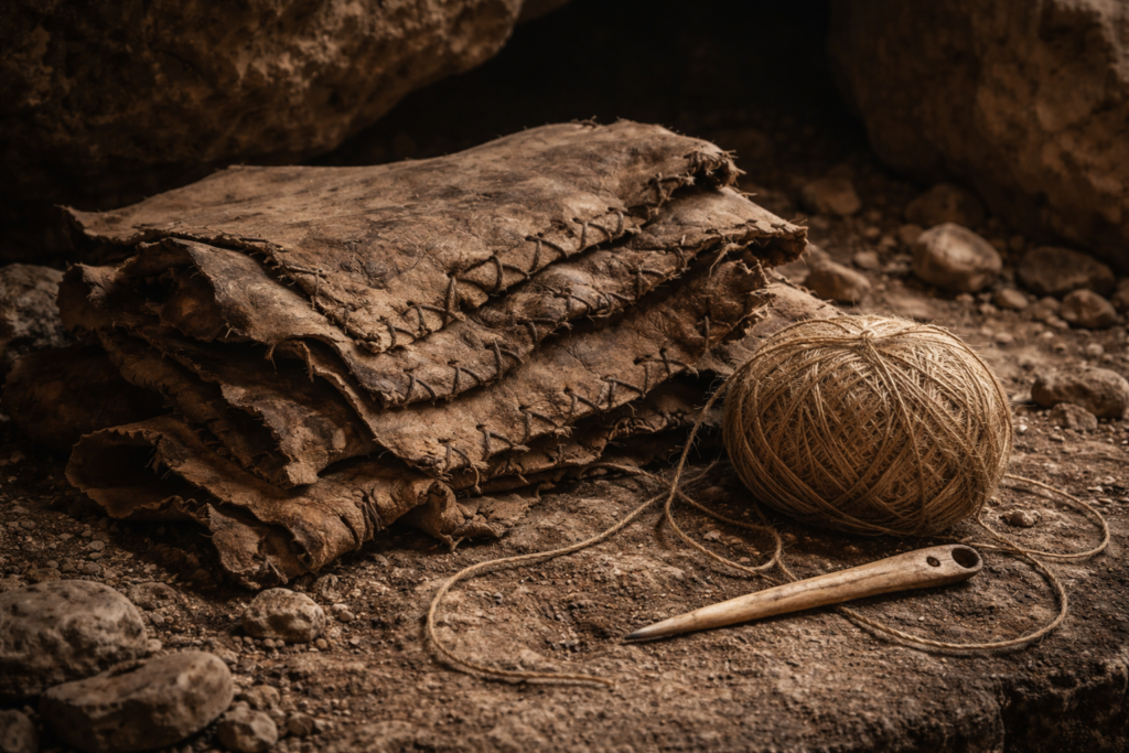 Stitched hides provide greater flexibility and thermal efficiency than simple wraps. Their construction reflects adaptation to both mobility and climate, reinforcing the idea of organized survival strategies.