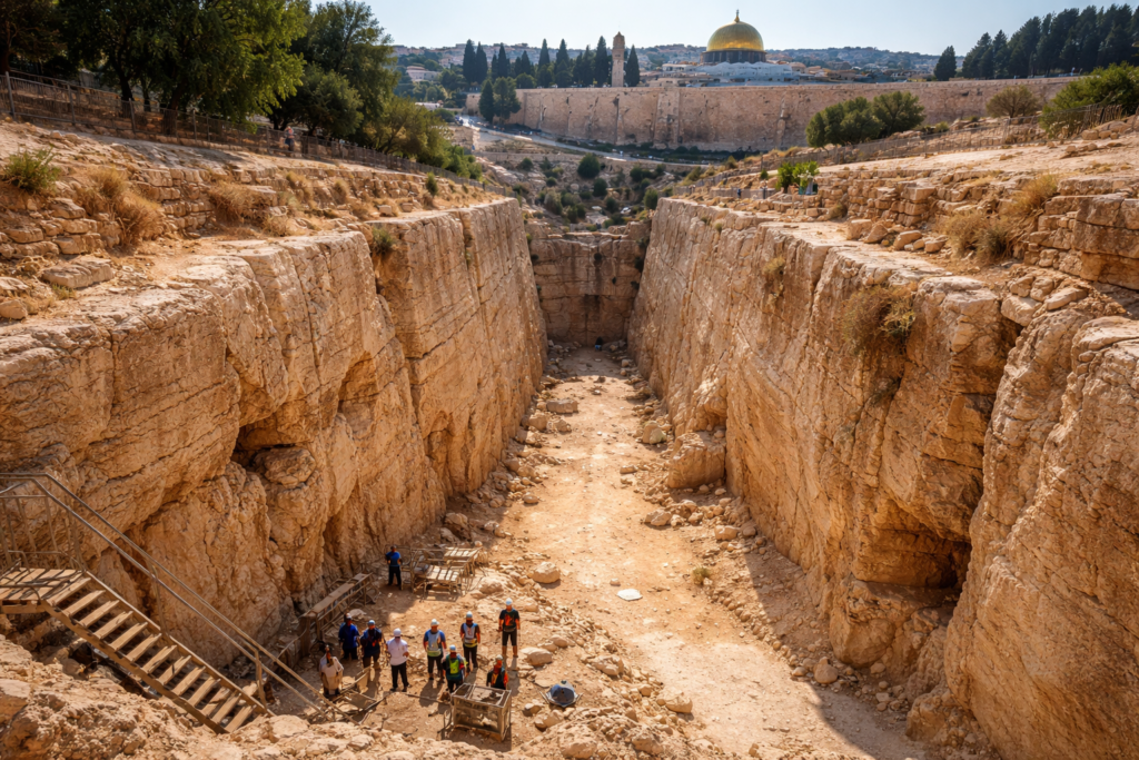 Beneath the southeastern ridge of Jerusalem, excavators uncovered a monumental rock hewn moat separating the City of David from the Ophel and Temple Mount zone. The feature is carved directly into limestone bedrock rather than built with masonry. Its dimensions are formidable, reaching roughly nine meters deep and more than thirty meters wide in certain exposed sections.