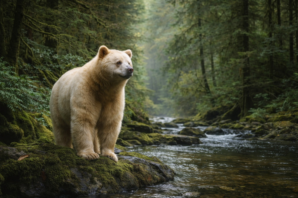 Legends don’t always focus on how the bear came to be. Some center on why it’s still here. According to certain narratives, the Spirit Bear is a protector of old wisdom, forest truths passed down not in books or buildings, but through behavior, silence, and instinct.