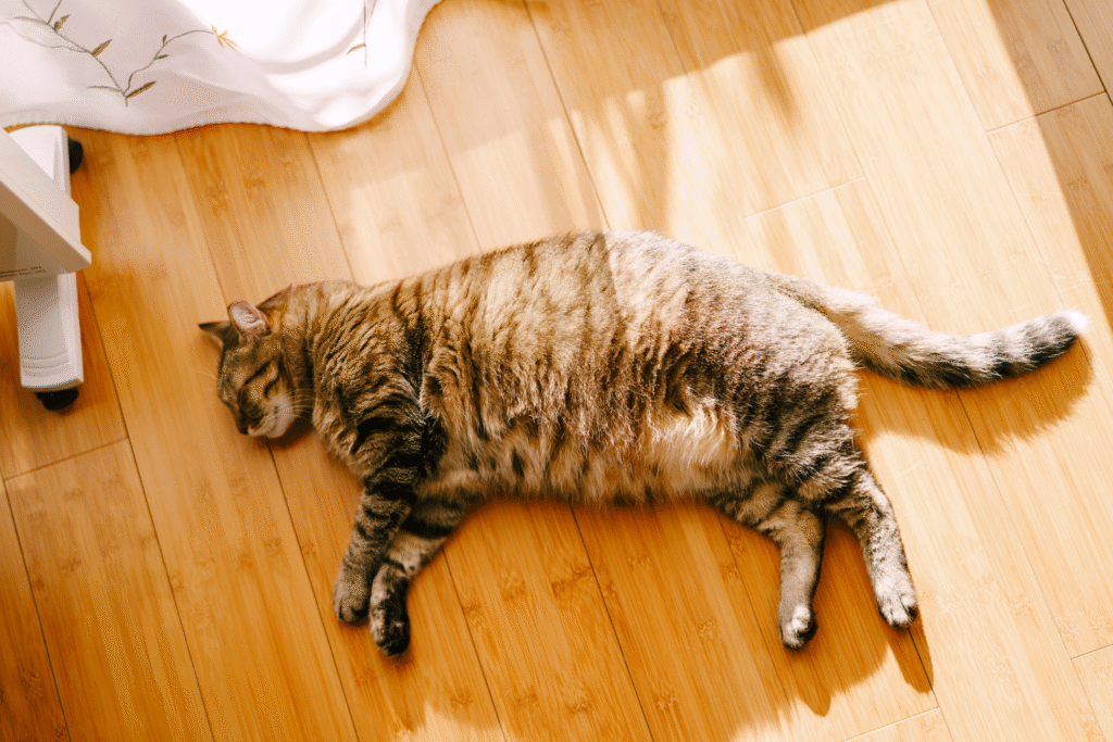 A healthy cat’s lean body allows heat to dissipate efficiently, but layers of fat act like insulation. Overweight cats overheat easily, especially during warm months or under stress. They might pant, spread out on cool floors, or seek shade more than usual.