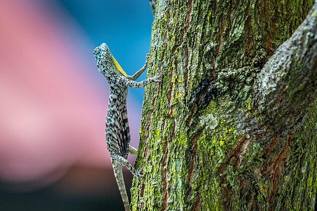 Draco lizards blend seamlessly into tree surfaces through mottled browns, greens, and grays. This camouflage remains effective even when stationary for long periods.