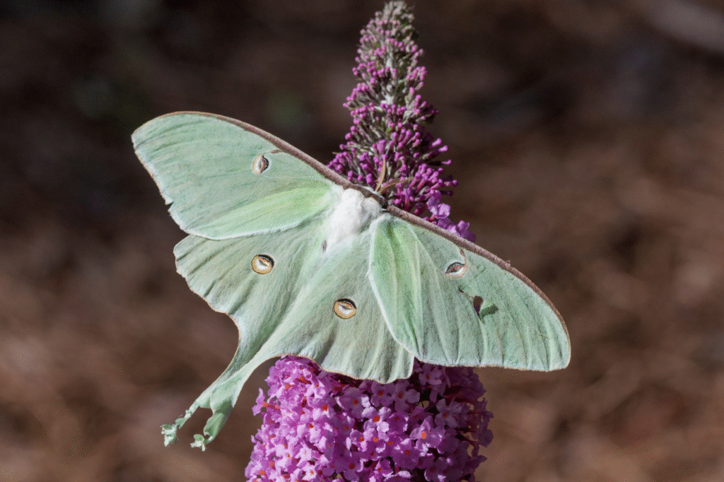 This pale-green moth with long, tail-like hindwings doesn’t even attempt to hide. Adults don’t eat and live only a few days, focusing entirely on mating before they fade away. Their size and fluorescent glow under moonlight make them look unreal, often startling hikers who catch them resting on tree trunks. Despite that size and brightness, they’re harmless and oddly calming to watch.